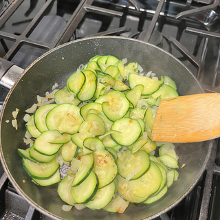 Place the avocado oil into a pan over medium heat and add in the onions and zucchini and cook until lightly browned (About 5 min)— Set aside.