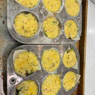Next, place about 1 T of the zucchini and onion mixture on top of the tortilla in the muffin tins. If there is extra at the end, you can add more to each tin. After this, place the egg mixture on top and fill to the top of all 12 spaces.